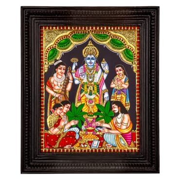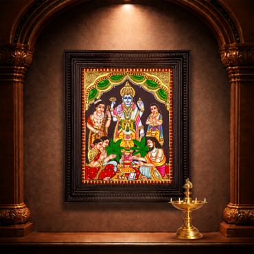 The painting showcases intricate craftsmanship with embossed detailing, vibrant flat colours, and a radiant gold finish. Created in the authentic Thanjavur tradition, each piece is meticulously handmade by skilled artisans, preserving the heritage and timeless beauty of Tanjore art.